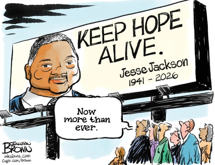 Rev. Jesse Jackson will be missed. He had a large impact on the left of our country, and his insistence on our agency from below made waves that are still moving outward, in ever-wider circles, now in Minneapolis, Chicago, Los Angeles, and elsewhere. Peace be upon him as well. Keep hope alive!
